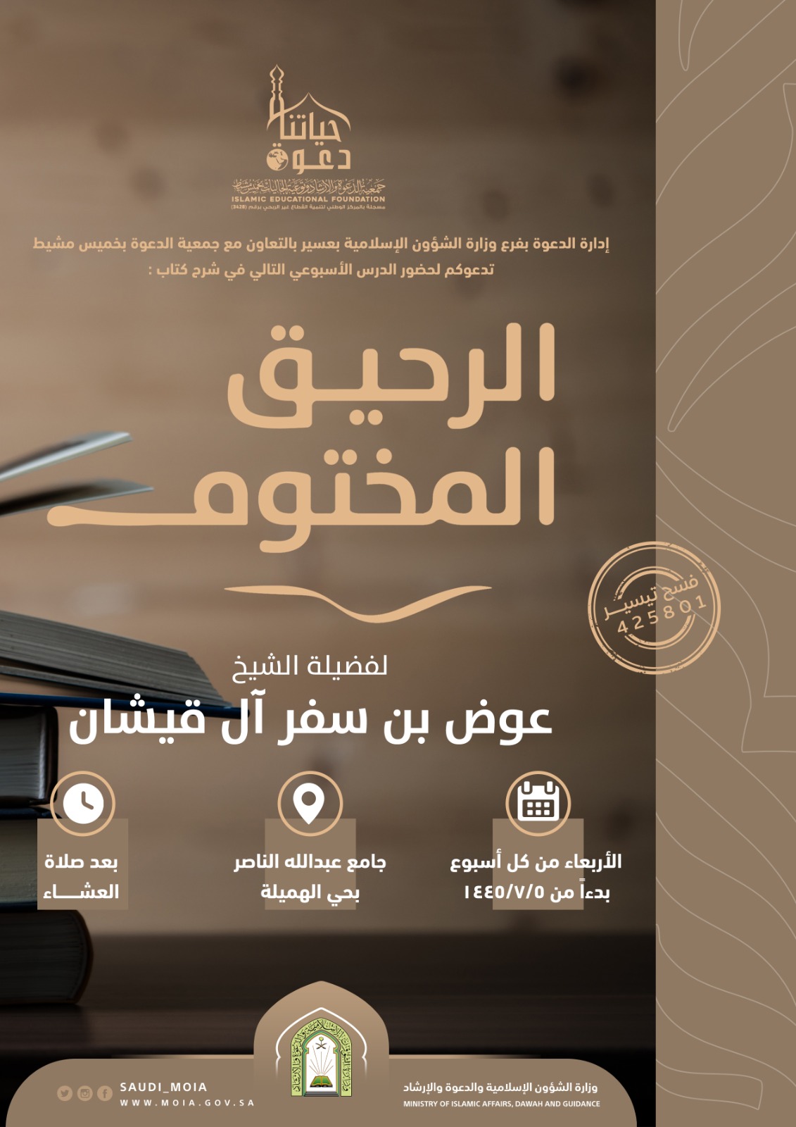 إدارة الدعوة بفرع وزارة الشؤون الإسلامية بعسير بالتعاون مع جمعية الدعوة وتوعية الجاليات بخميس مشيط تدعوكم لحضور الدرس الأسبوعي التالي في شرح كتاب الرحيق المختوم يقدمها الشيخ : عوض بن مسفر آل قيشان بجامع عبدالله الناصر بحي الهميلة بعد صلاة العشاء الأربعاء من كل أسبوع بدءاً من 5/ 7/ 1445ه