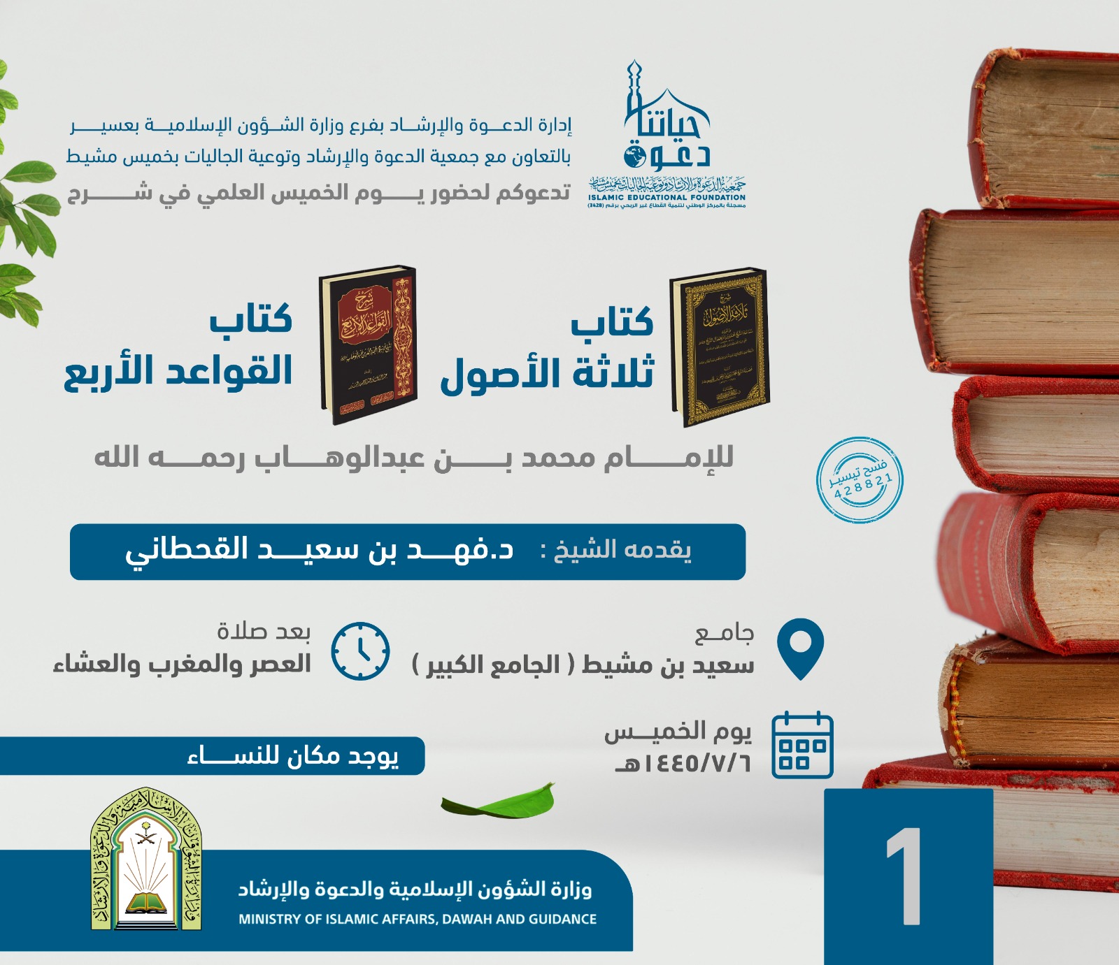 إدارة الدعوة بفرع وزارة الشؤون الإسلامية بعسير بالتعاون مع جمعية الدعوة بخميس مشيط دعوتكم لحضور محاضرة في شرح كتاب ثلاثة الأصول وكتاب القواعد الأربع للإمام محمد بن عبدالوهاب يقدمها الشيخ : د. فهد بن سعيد القحطاني بجامع سعيد بن مشيط (الجامع الكبير) بعد صلاة العصر والمغرب والعشاء يوم الخميس 6/ 7/ 1445ه