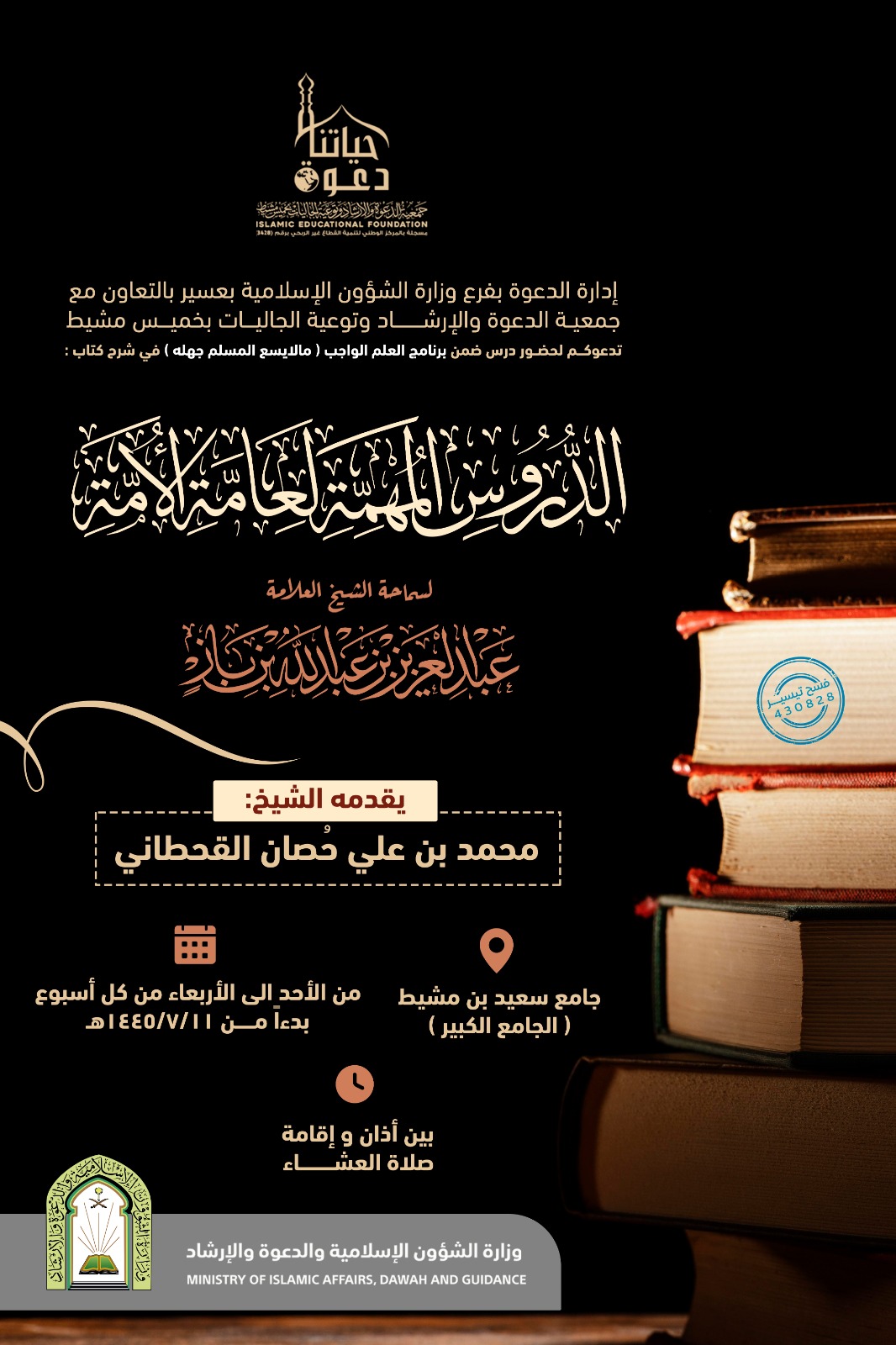 يسر إدارة الدعوة والإرشاد بفرع وزارة الشؤون الإسلامية بعسير بالتعاون مع جمعية الدعوة وتوعية الجاليات بمحافضة خميس مشيط تدعوكم لحضور الدرس التالي في شرح كتاب الدروس المهمة لعامة الأمة لسماحة الشيخ عبدالعزيز بن باز رحمه الله يقدمه الشيخ : محمد بن علي حٌصان القحطاني بجامع سعيد بن مشيط الجامع الكبير بين آذان وإقامة صلاة العشاء من الأحد إلى الأربعاء بدءاً من 11/ 7/ 1445هـ .
