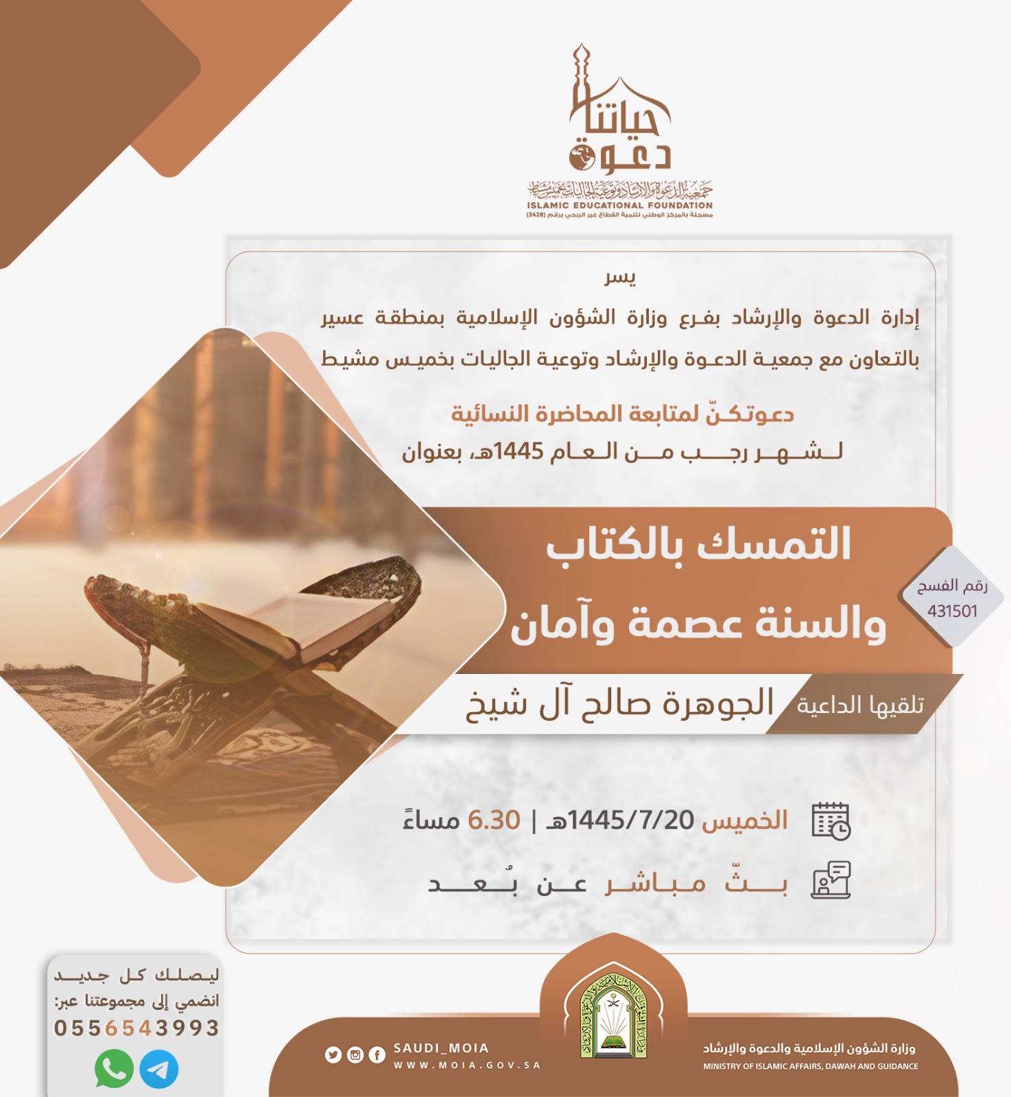 يسر إدارة الدعوة بفرع وزارة الشؤون الإسلامية بعسير بالتعاون مع جمعية الدعوة وتوعية الجاليات بخميس مشيط دعوتكنّ لمتابعة المحاضرة النسائية بعنوان: التمسك بالكتاب والسنة عصمة وآمان تقدمها الداعية: أالجوهرة صالح آل شيخ يوم الخميس 20/ 7/ 1445هـ الساعة 6.30 مساءً بث مباشر عن بعد.