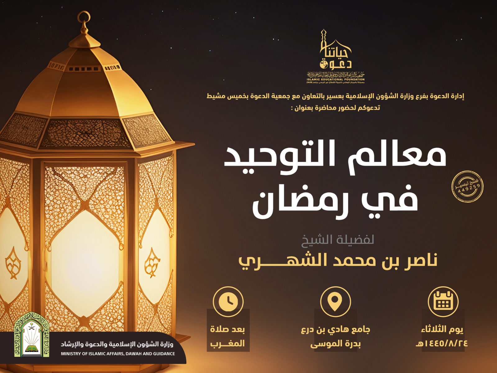 إدارة الدعوة والإرشاد بفرع وزارة الشؤون الإسلامية بعسير بالتعاون مع جمعية الدعوة وتوعية الجاليات بخميس مشيط تدعوتكم لحضور محاضرة بعنوان معالم التوحيد في رمضان لفضيلة الشيخ :ناصر بن محمد الشهري يوم الثلاثاء 24/ 8/ 1445ه بجامع هادي بن درع بدرة الموسى بعد صلاة المغرب .