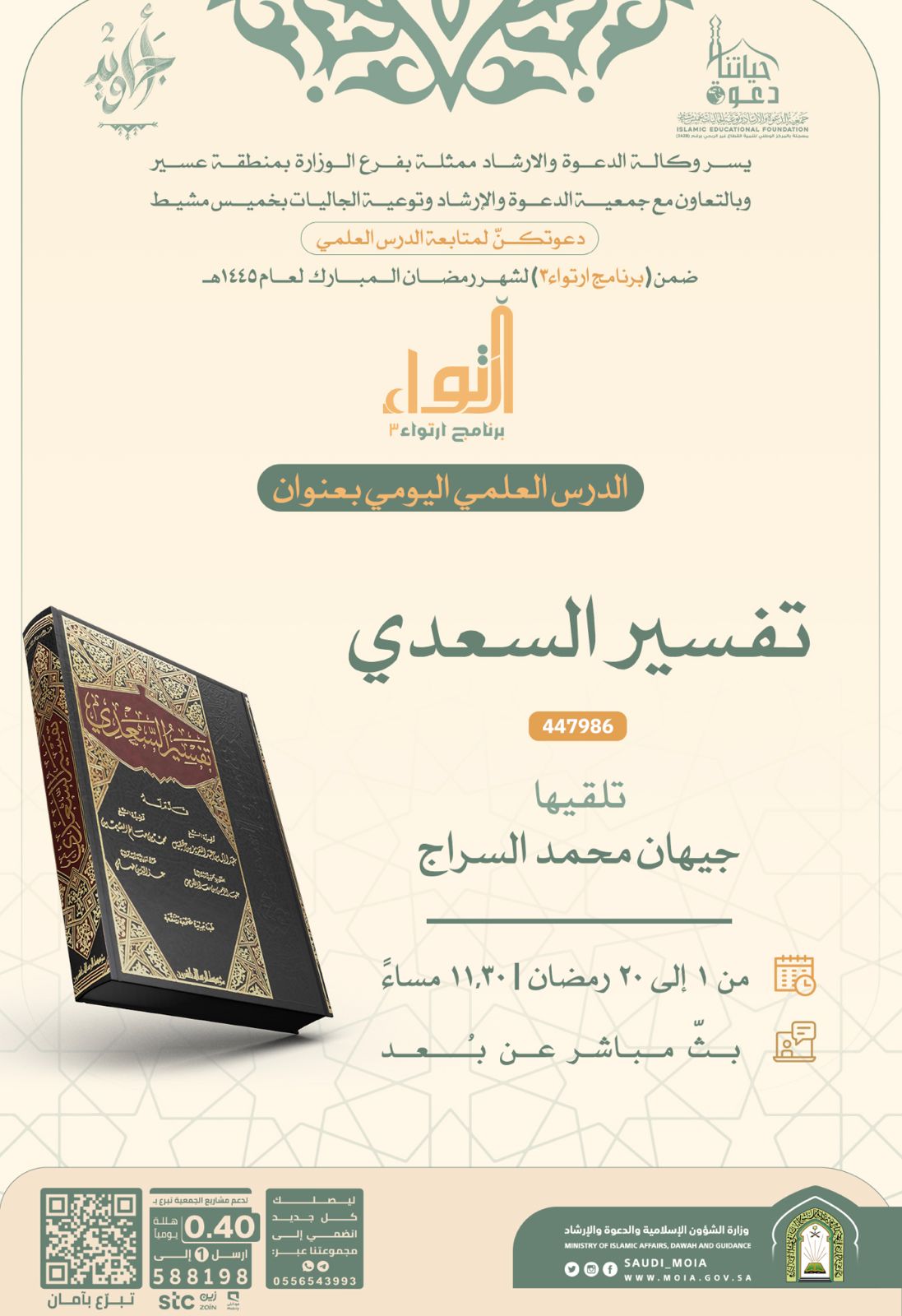 إدارة الدعوة والإرشاد بفرع وزارة الشؤون الإسلامية بعسير بالتعاون مع جمعية الدعوة وتوعية الجاليات بخميس مشيط دعوتكنّ لمتابعة الدرس العلمي اليومي بعنوان تفسير السعدي تلقيها الداعية : جيهان محمد السراج من 1-20 رمضان الساعة 11:30 مساءً بث مباشر عن بعد.