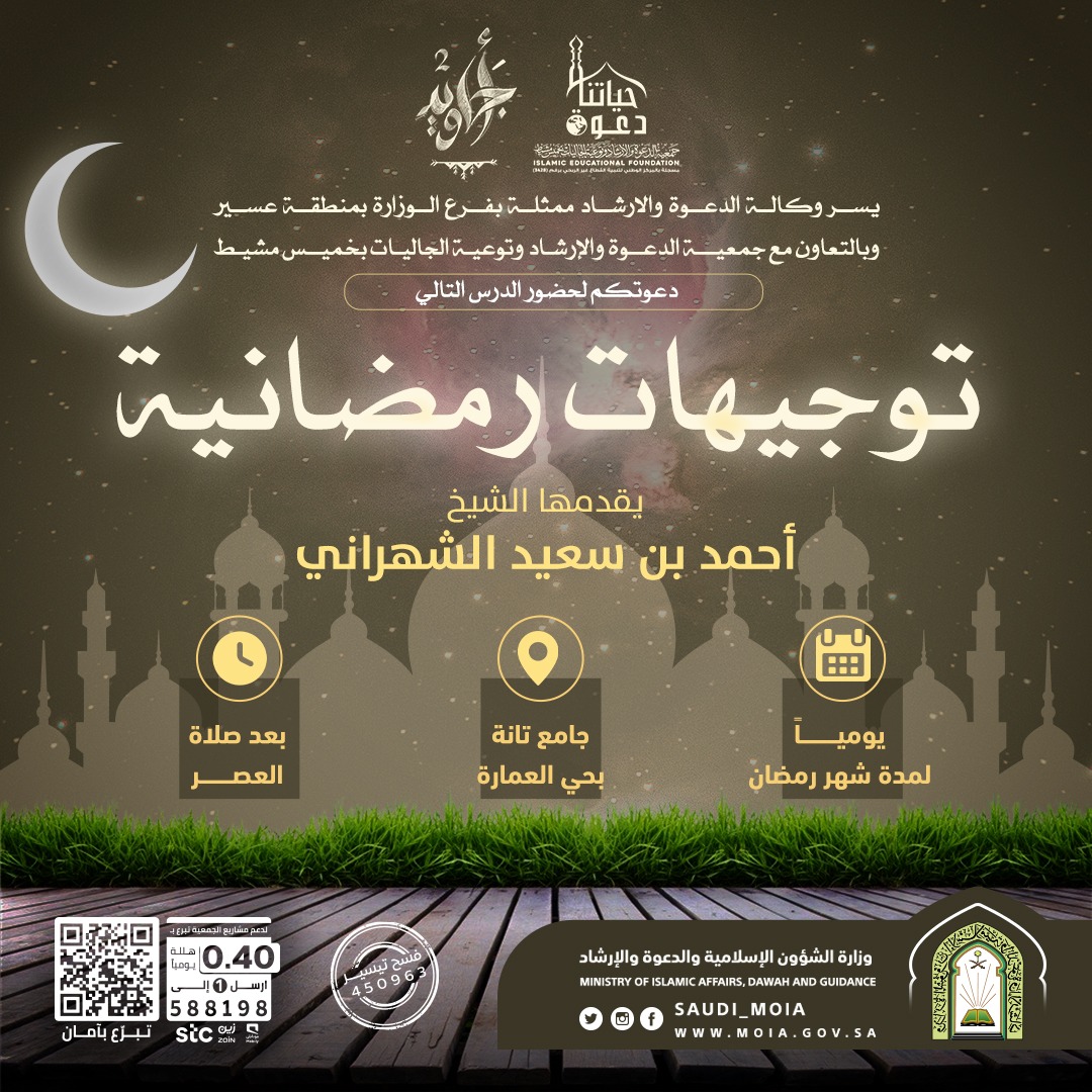 إدارة الدعوة والإرشاد بفرع وزارة الشؤون الإسلامية بعسير بالتعاون مع جمعية الدعوة وتوعية الجاليات بخميس مشيط دعوتكم لحضور الدرس التالي توجيهات رمضانية لفضيلة الشيخ : أحمد بن سعيد الشهراني يومياً لفترة شهر رمضان بجامع تانة بحي العمارة بعد صلاة العصر .