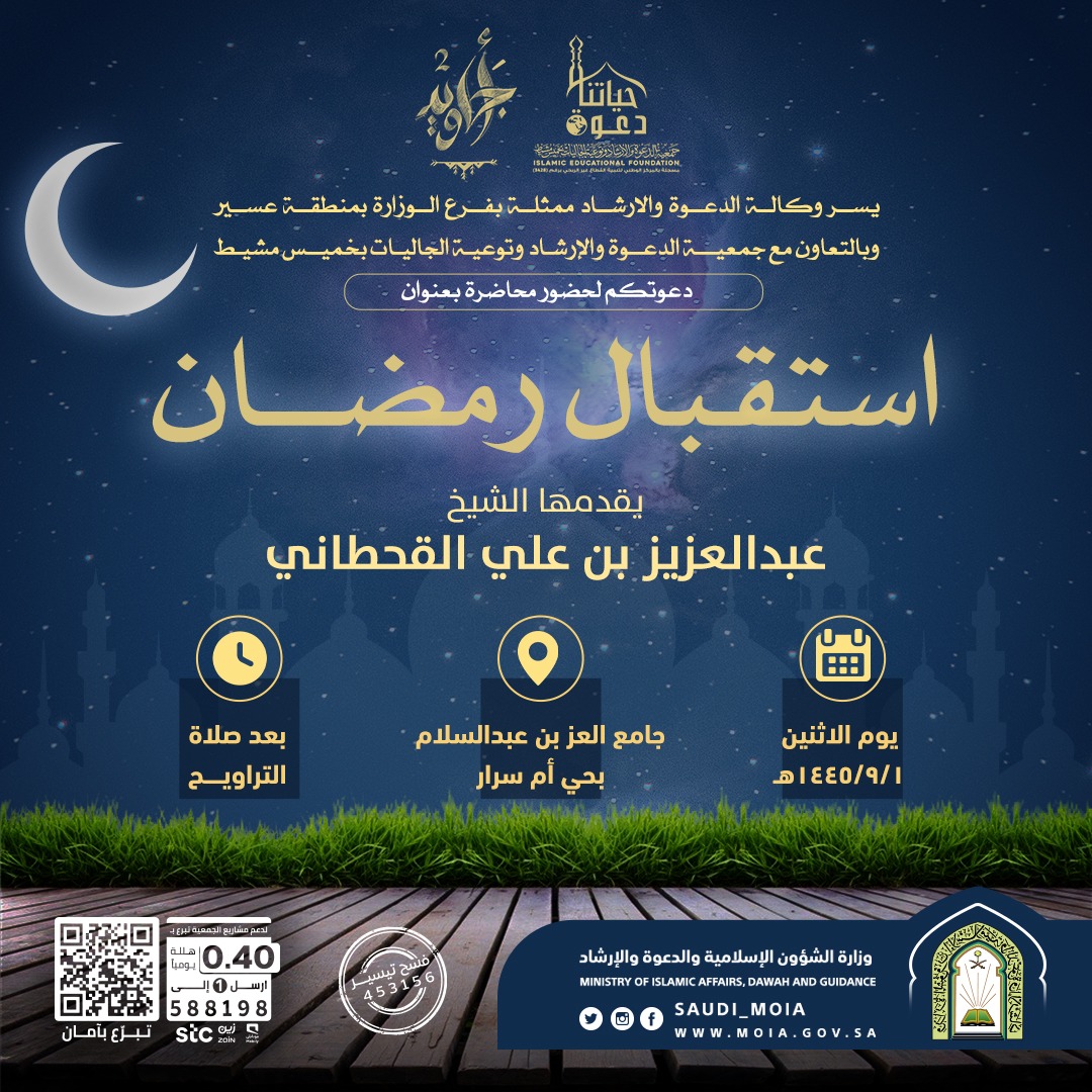 إدارة الدعوة والإرشاد بفرع وزارة الشؤون الإسلامية بعسير بالتعاون مع جمعية الدعوة وتوعية الجاليات بخميس مشيط دعوتكم لحضور محاضرة بعنوان استقبال رمضان لفضيلة الشيخ : عبدالعزيز بن علي القحطاني يوم الاثنين 1/ 9/ 1445هـ بجامع العز بن عبدالسلام بحي أم سرار بعد صلاة التراويح.